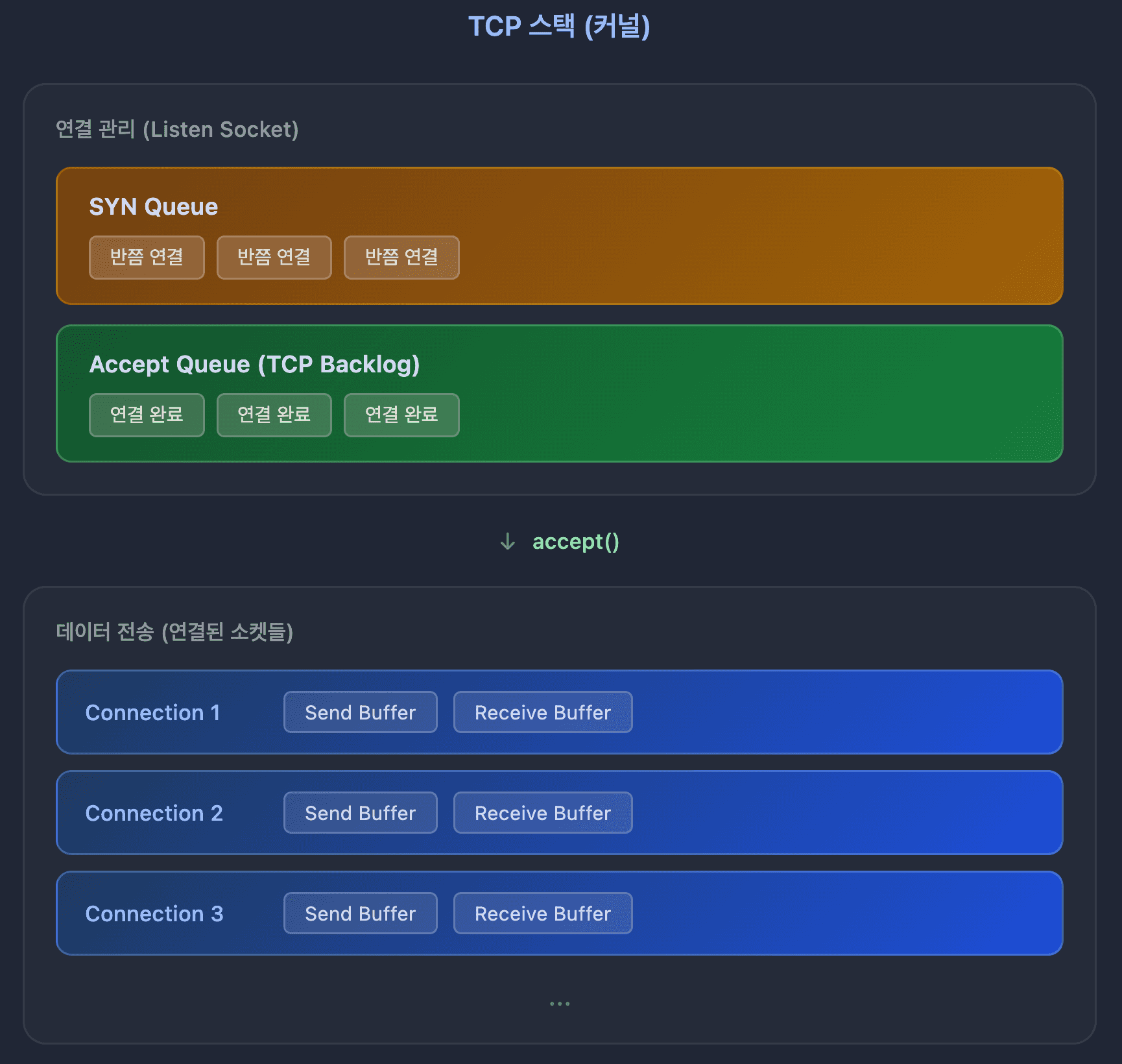 중요: Accept Queue는 이미 3-Way Handshake가 완료된 연결들입니다. 커널 레벨에서는 연결이 완료됐지만, 서버 애플리케이션이 아직