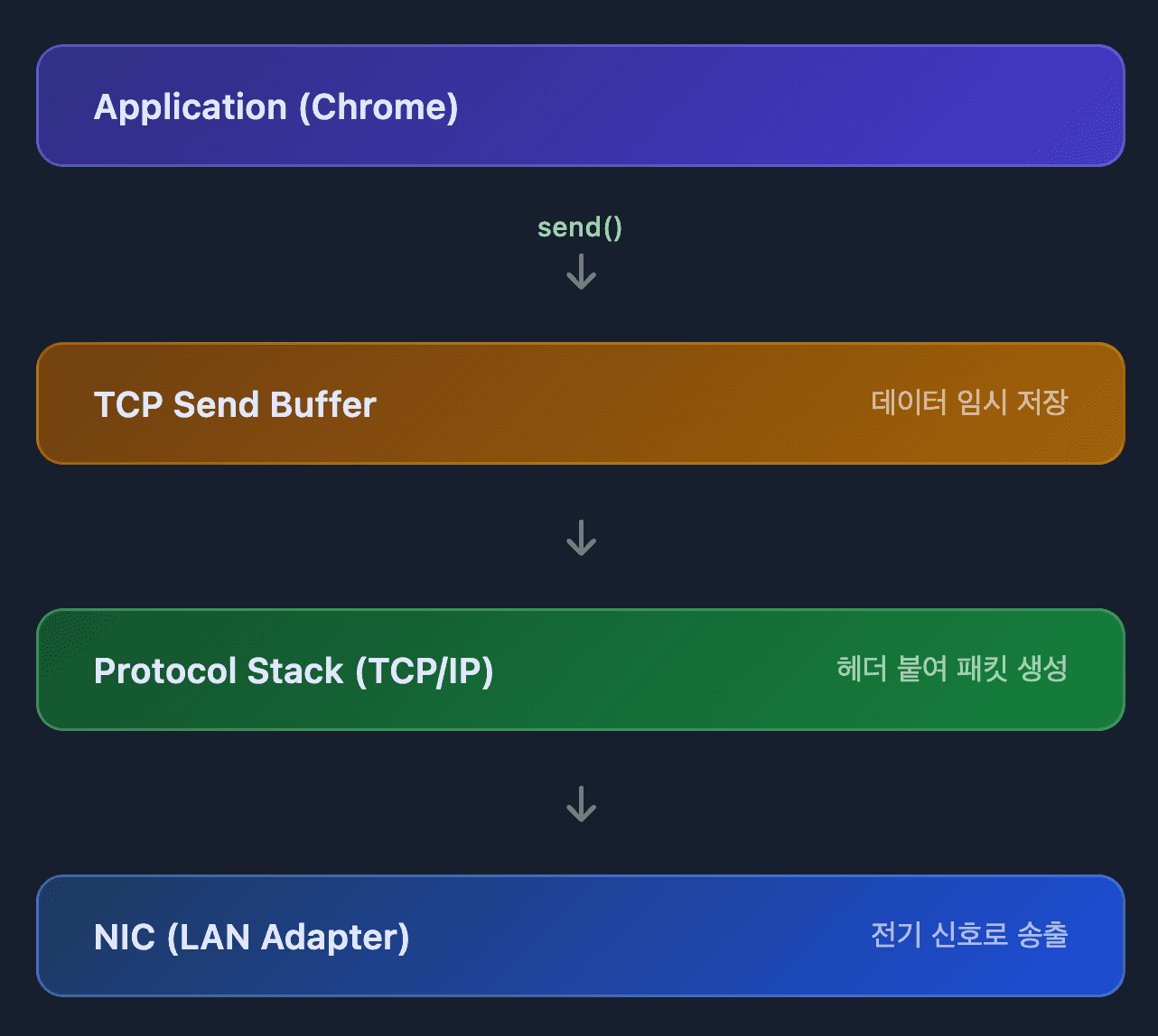 └─────────────────────────────────────┘브라우저가 직접 랜카드를 제어할 수 없습니다. 하드웨어 접근은 커널만 가능하거든요. 그래서 브라우저는 socket(), connect(), send() 같은 시스템 콜을 통해 OS에 "이 데이터 좀 보내줘"라고 요청하는 겁니다.