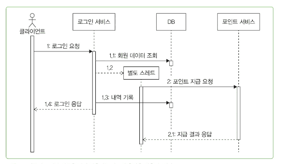 포인트 서비스에 일시적으로 문제가 생겨 포인트 지급 처리에 시간이 오래 걸려도 로그인 서비스의 응답 시간은 증가하지 않습니다. 사용자는 평소처럼 로그인에 성공하고 서비스를 사용할 수 있습니다. 단지 포인트가 평소보다 조금 늦게 지급될 뿐입니다.