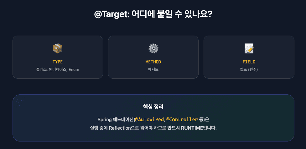 @Target(ElementType.METHOD) // 메서드 위에만 붙이세요!
