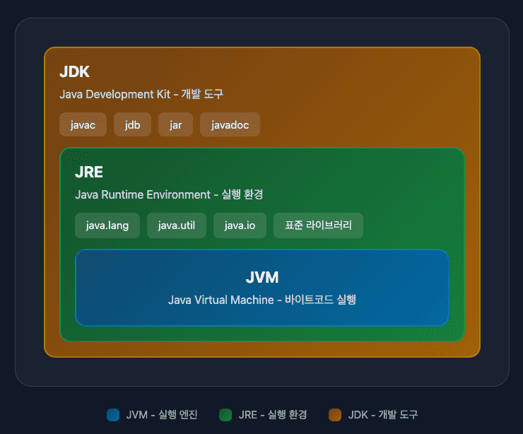 - JRE + 개발 도구 (javac, jdb, jar 등)