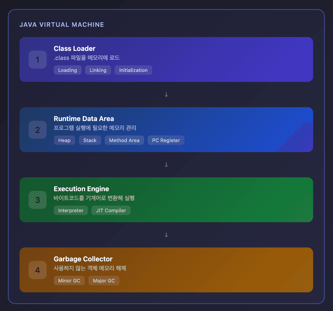 JVM 덕분에 Java는 플랫폼 독립적이고, 개발자가 메모리 관리를 직접 하지 않아도 됩니다.