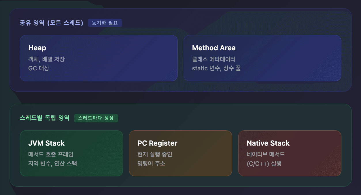 | JVM Stack | 메서드 호출 시 프레임 생성. 지역 변수, 연산 스택 저장 |