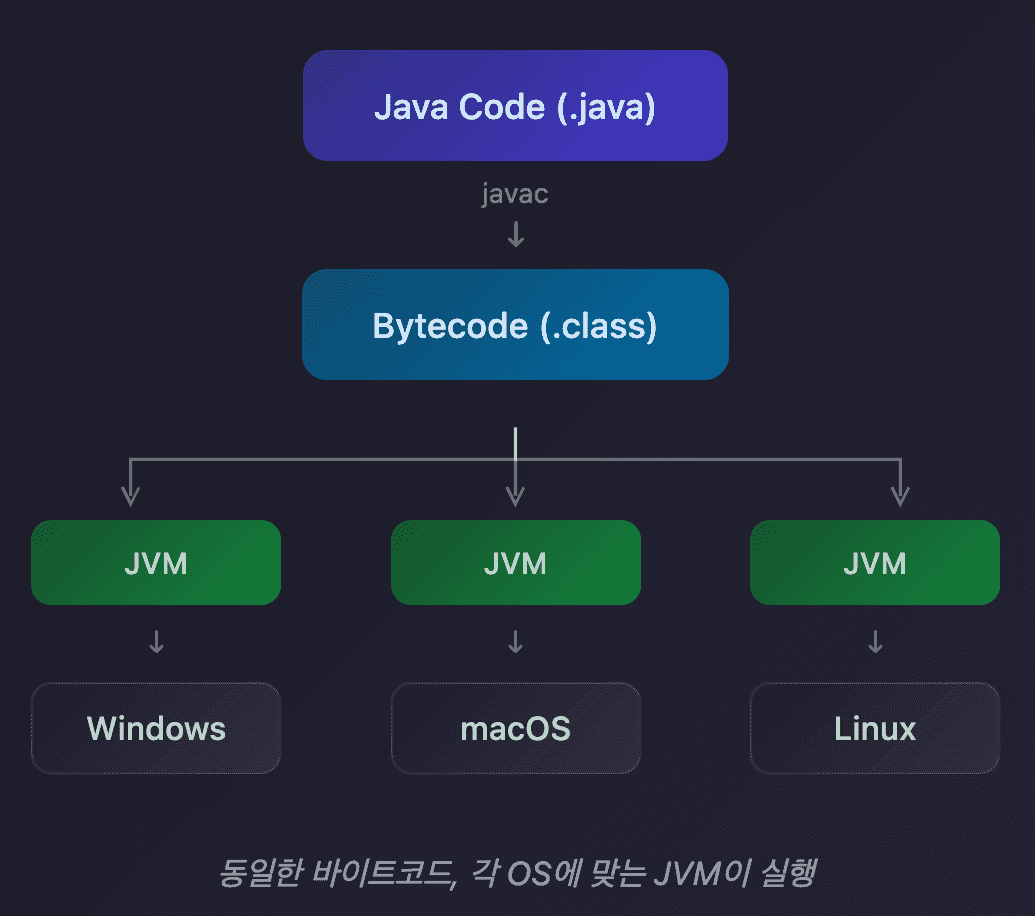 Windows에서는 Windows용 JVM이, Mac에서는 Mac용 JVM이 동일한 바이트코드를 실행합니다.