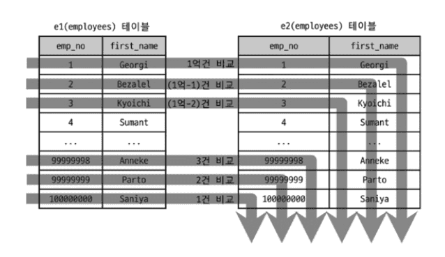 WHERE e2.emp_no >= e1.emp_no;| id | select_type | table | type | Extra |