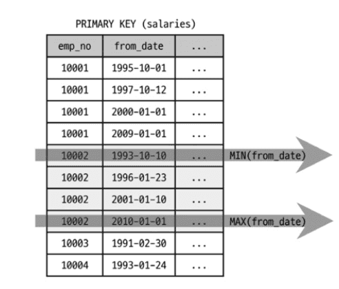 SELECT emp_no, MIN(from_date), MAX(from_date)