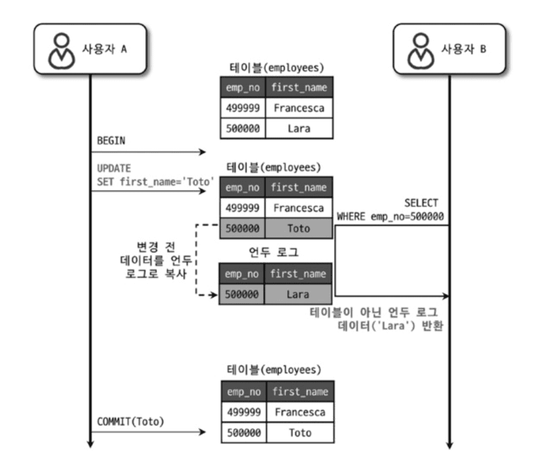 - 커밋 안 된 데이터: 언두 로그에서 변경 전 데이터를 읽음