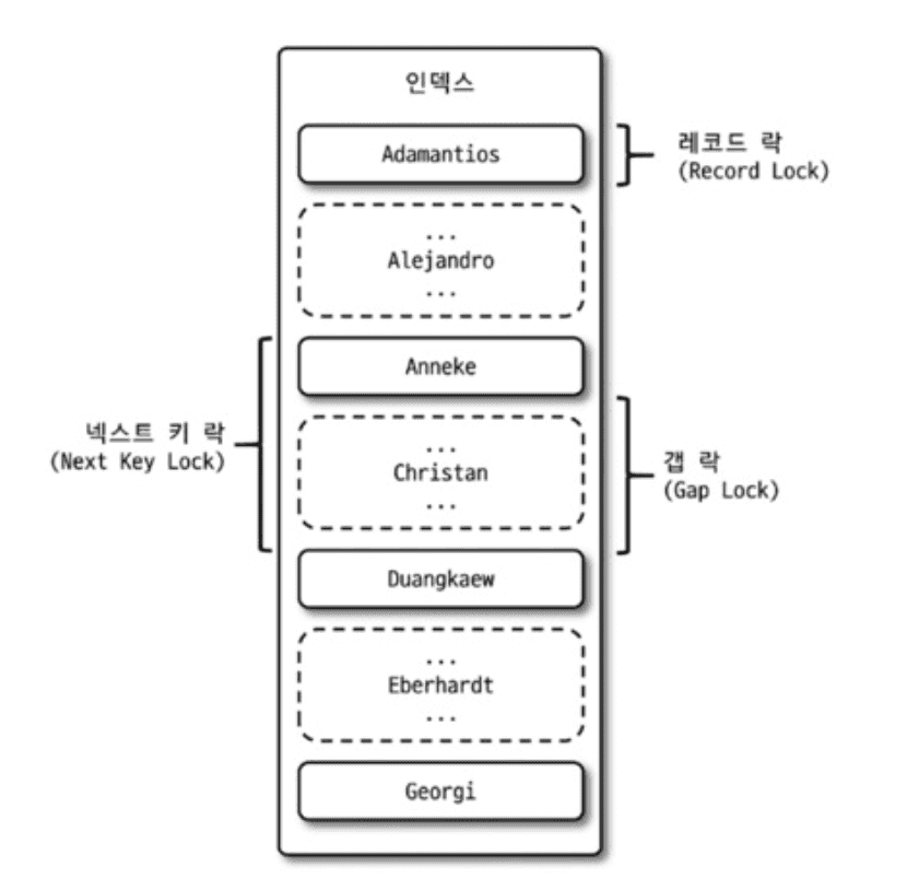 갭 락 (Gap Lock): 레코드 사이 간격을 잠궈 INSERT 차단