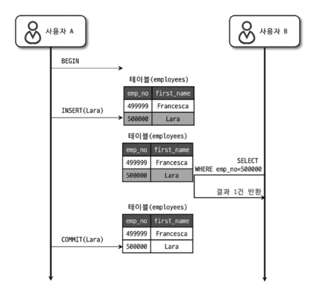 - 사용자 B가 똑같은 SELECT 쿼리로 다시 조회 → 결과 1건 조회됨