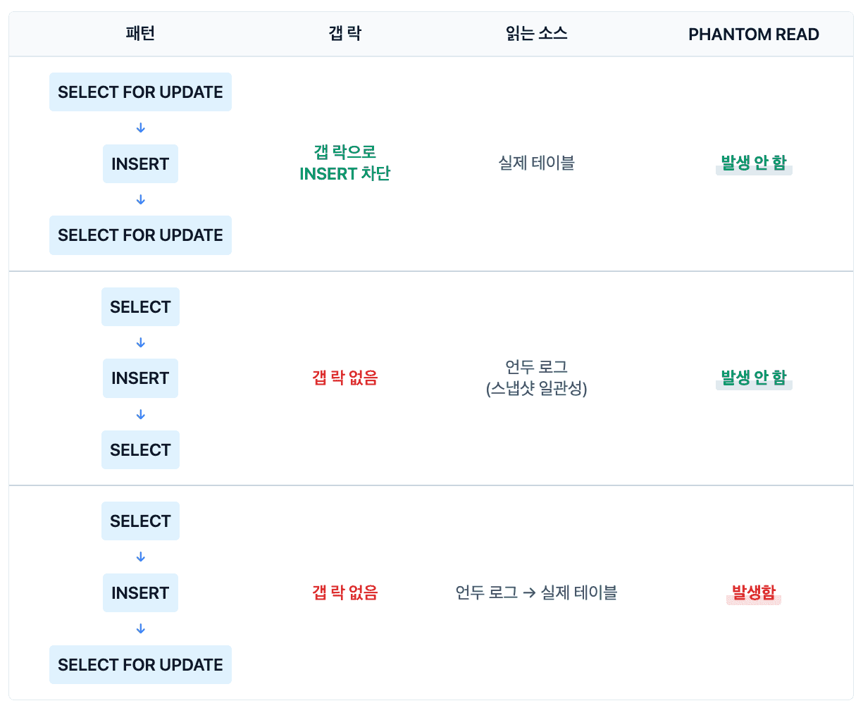하지만 SELECT -> INSERT -> SELECT FOR UPDATE 순서면 PHANTOM READ가 발생할 수 있습니다.