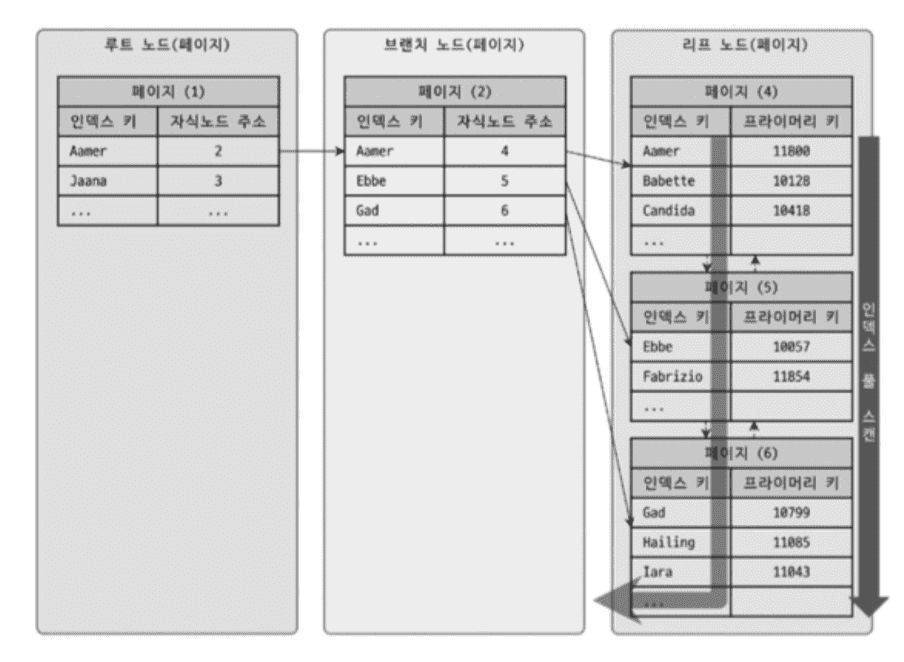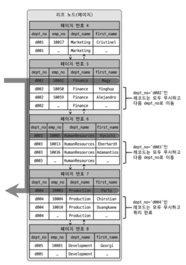 ↑ 찾음 ↑ 다음 레코드 확인 (메모리에서 비교)- 디스크 I/O 없음 (이미 로드된 페이지)