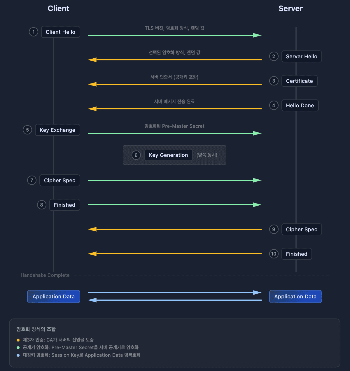 그래서 키 교환에만 공개키 사용(Pre-Master Secret 1회 전송), 실제 통신은 대칭키 사용(세션 키로 빠르게 암호화/복호화)하는 것이다.