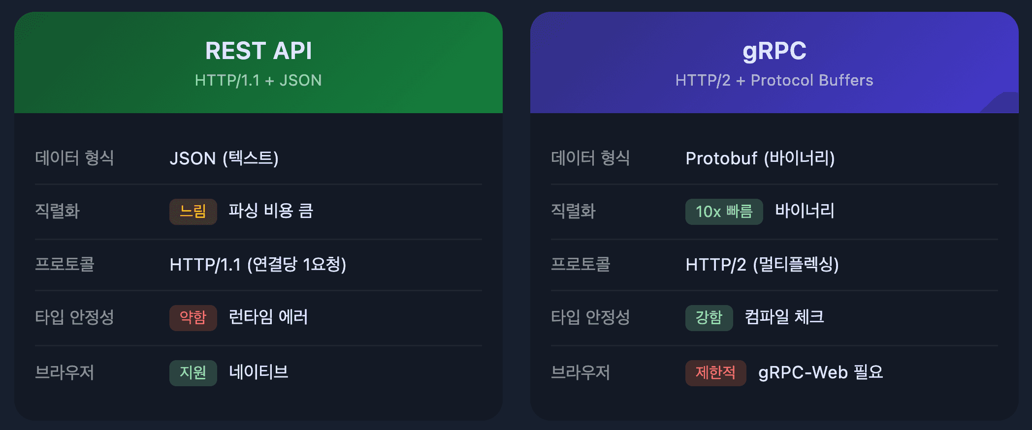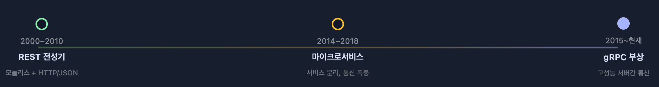 모놀리스 시대에는 REST API로 충분했다. 하지만 마이크로서비스로 전환되면서 서비스 간 통신이 폭발적으로 증가했고, JSON 직렬화/역직렬화 오버헤드가 문제가 됐다.