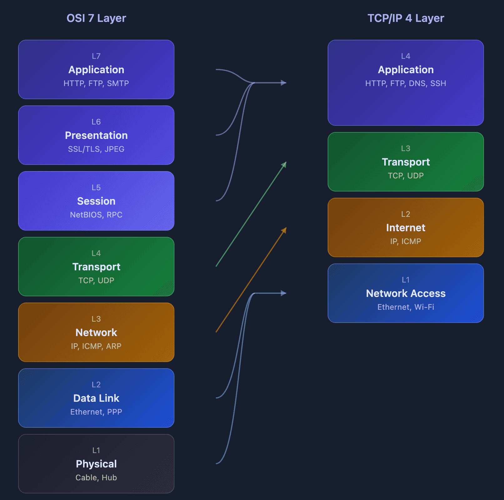 - OSI L1, L2 → TCP/IP Network Access Layer