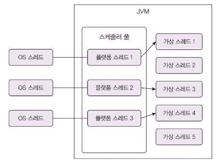 이 책에서는 필자가 익숙한 자바를 기준으로 설명하겠다. [그림 7.3]에서 보는 것처럼 JVM은 플랫폼 스레드(OS 스레드에 1:1로 대응하는 래퍼(wrapper))로 구성된 풀을 유지한다. CPU가 OS 스케줄러에 의해 여러 스레드를 번갈아 실행하는 것처럼 플랫폼 스레드도 JVM 스케줄러에 의해 여러 가상 스레드를 번갈아 실행한다. JVM은 기본적으로 풀에 CPU 코어 개수만큼 플랫폼 스레드를 생성하고 필요에 따라 플랫폼 스레드를 증가시킨다. 이 책을 쓰는 시점에서 풀에 최대로 생성할 수 있는 플랫폼 스레드 개수의 기본값은 256이다.