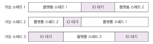 [그림 7.4]에서 플랫폼 스레드 1은 먼저 가상 스레드 1을 실행한다. 가상 스레드 1이 I/O 대기와 같은 블로킹 연산을 만나면, 플랫폼 스레드 1은 가상 스레드 1의 블로킹이 끝날 때까지 기다리지 않고 실행 가능한 다른 가상 스레드를 찾아서 연결한다. 이런 방식으로 플랫폼 스레드 2는 가상 스레드 2를 실행했다가, 가상 스레드 3을 실행하고 다시 가상 스레드 1을 실행하게 된다.