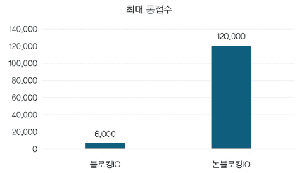 [그림 7.7]의 수치는 JVM에 힙 메모리를 1.5G 할당했을 때 측정한 것으로 블로킹 I/O 방식으로 구현된 서버의 최대 동접수는 6천 정도가 나왔다. 반면 논블로킹 I/O 방식으로 구현한 서버는 동일한 조건에서 12만 정도가 나왔다. 약 20배 정도 성능이 향상된 것을 확인할 수 있었다.